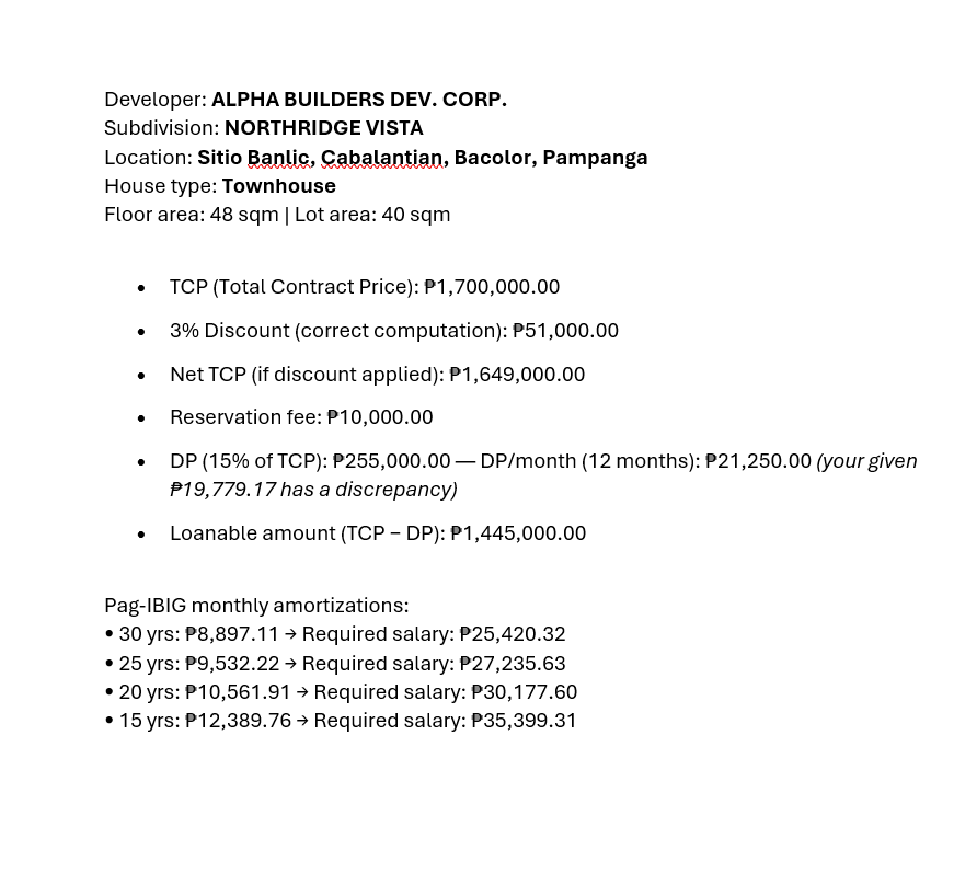 DP (15% of TCP): β±255,000.00 β DP/month (12 months): β±21,250.00 (your given β±19,779.17 has a discrepancy)